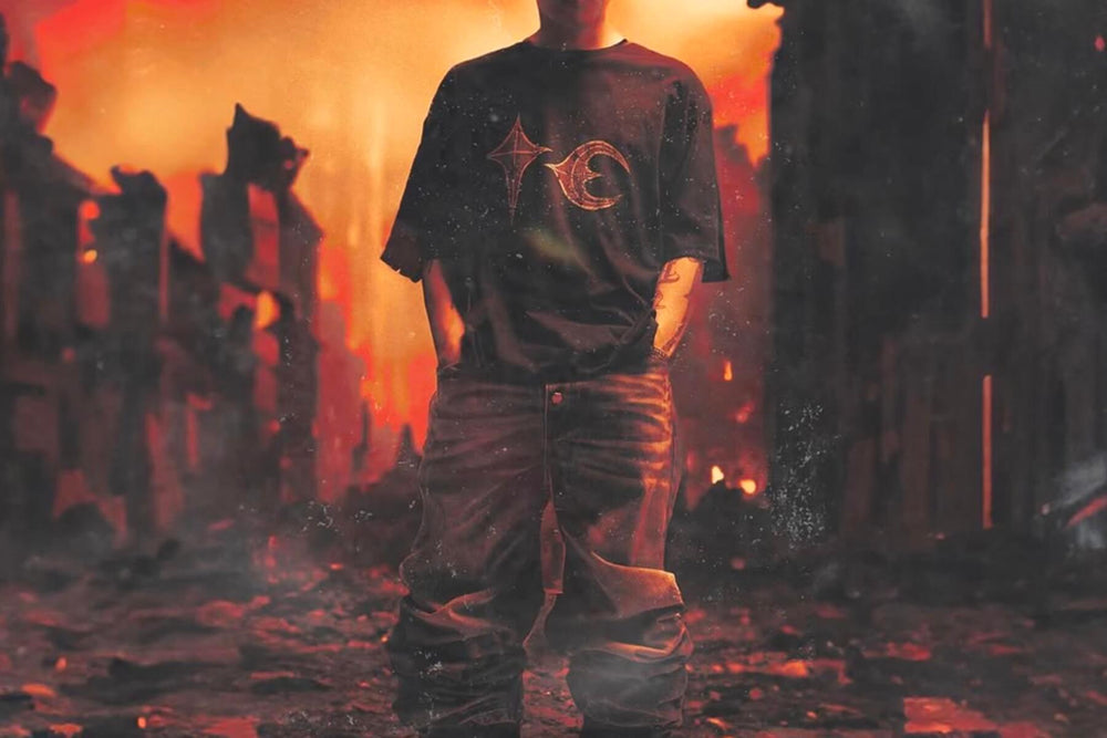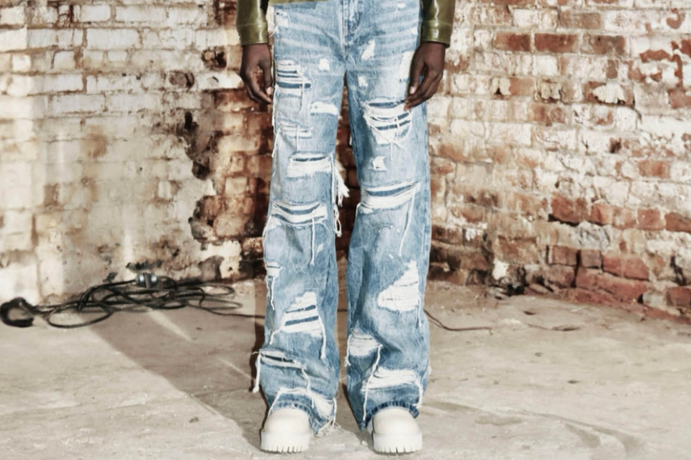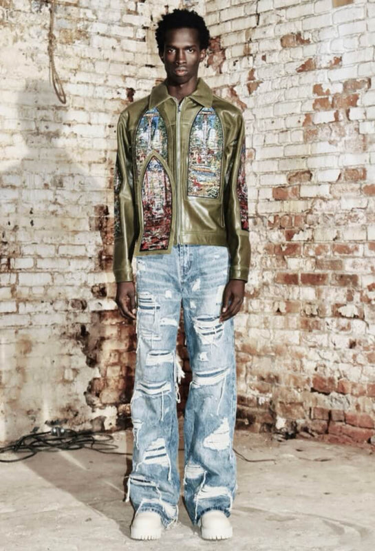 Clothing rack with Casablanca Paris clothes, Rick Owens shoes, and a chrome hearts wall art piece at Feuille