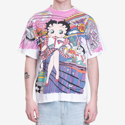 This vintage Betty Boop t-shirt showcases the beloved character in a retro diner setting, blending 1950s Americana charm with her timeless style. Featuring vibrant, all-over graphics and Betty's Diner on the back, this tee captures the nostalgic spirit of classic cartoons and vintage pop culture.