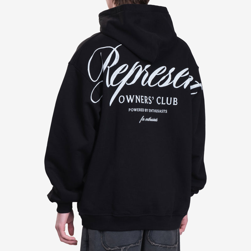 Introducing the newest version of the Represent Owners' Club Hoodie in Black. Made from thick jersey cotton, it has a relaxed, oversized fit with ribbed hems and cuffs. The hood has a Cobrax snap and the pocket has a Represent logo.