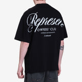 Introducing the newest version of the Owners' Club T-Shirt in Black - a stylish oversized tee made from high-quality medium weight cotton. Featuring a ribbed crewneck and a Represent metal bar on the hem. Our t-shirt boasts a screen print script graphic on the back, with a natural paint brush effect on the print itself. It perfectly combines the original style with our "Powered by enthusiasts, for enthusiasts" motto.