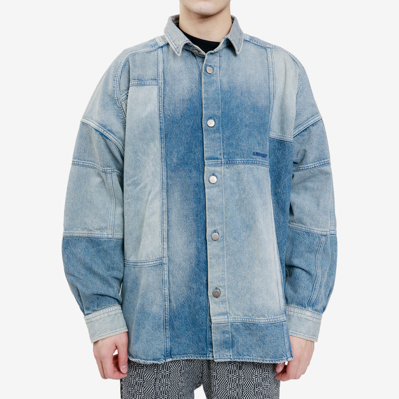 This patchwork denim shirt features a button front closure, embroidered logo on the left chest, and button adjustable cuffs. It also has a collar and is made of 100% cotton. Crafted in Japan.