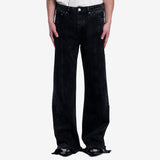 Vegan logo patch at back waistband, branded button fly, branded rivets, logo embroidery on back yoke, and distressed back hem - all featured in these washed black denim jeans with a relaxed fit.