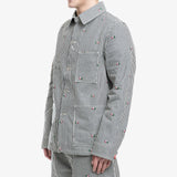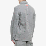 The KENZO Rinse Striped Workwear Denim Jacket offers a classic touch with its pinstripe design and embroidered floral accents, crafted from 100% cotton for durability and comfort. Made in Portugal, this jacket combines workwear functionality with refined style, featuring multiple pockets and button closure for a versatile, elevated look.