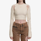 Elevate your wardrobe with the Off-White Women's Sleek LS Crop Top. Crafted from a premium stretch fabric, this fitted long-sleeve features bold shoulder cutouts, a cropped silhouette, and subtle Off-White branding on the front. A fusion of elegance and streetwear, it's perfect for layering or standing out solo.