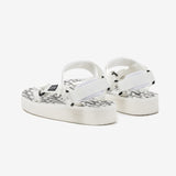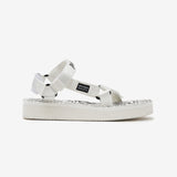 These white webbing sandals feature an open toe, Velcro straps at the vamp and ankle, a logo patch on the outer side, a padded heel, a logo pattern on the molded foam rubber footbed, a logo embossed on the platform foam rubber midsole, and a treaded rubber sole.