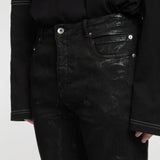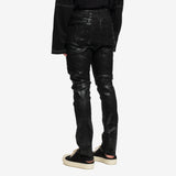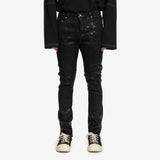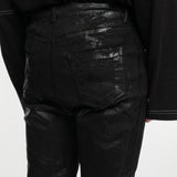 This black stretch denim has been garment-treated with a black foil finish for a lightweight feel. The fabric is overdyed and then sprayed with a black glue, followed by pressing with a black foil for a durable and polished look.