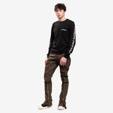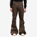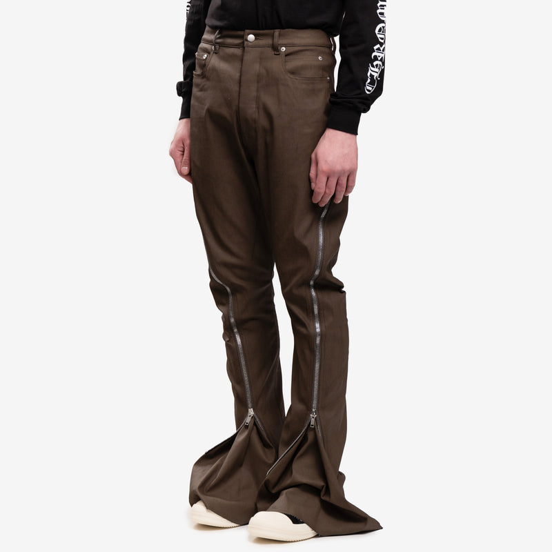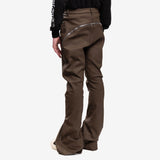 These Bolan Banana jeans are high-waisted, slim fit with 5 pockets and a floor-length boot cut. They have a waistband, belt loops, pocket rivets, and a concealed button fly. The long zipper runs from the center of the back, curves around the hip, and can be unzipped to expose the butt. It can also zip up from the hem to reveal a flared panel in the leg.