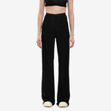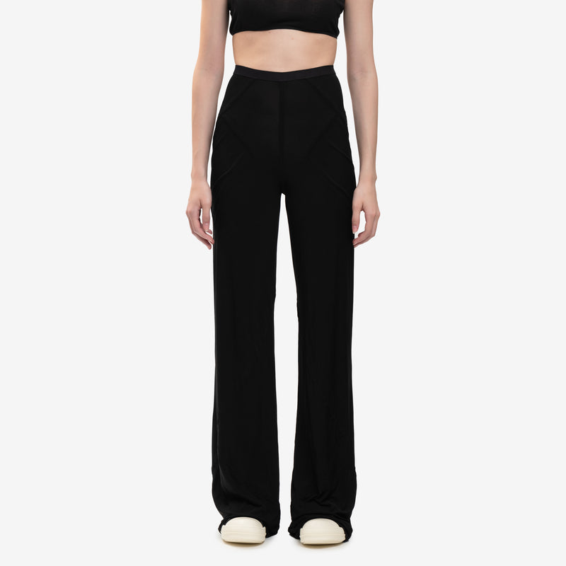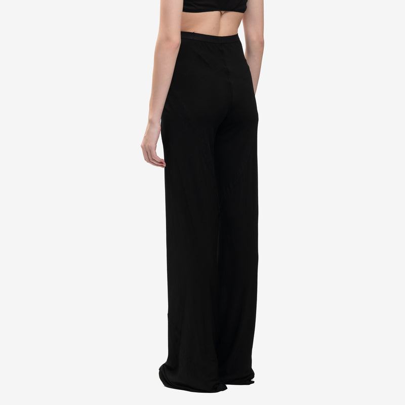 These lounge pants have a floor-length design, are cut on bias for extra width and loose fit, and feature a ribbed elastic waistband and raw-cut hems.
