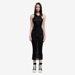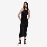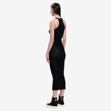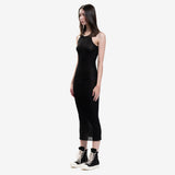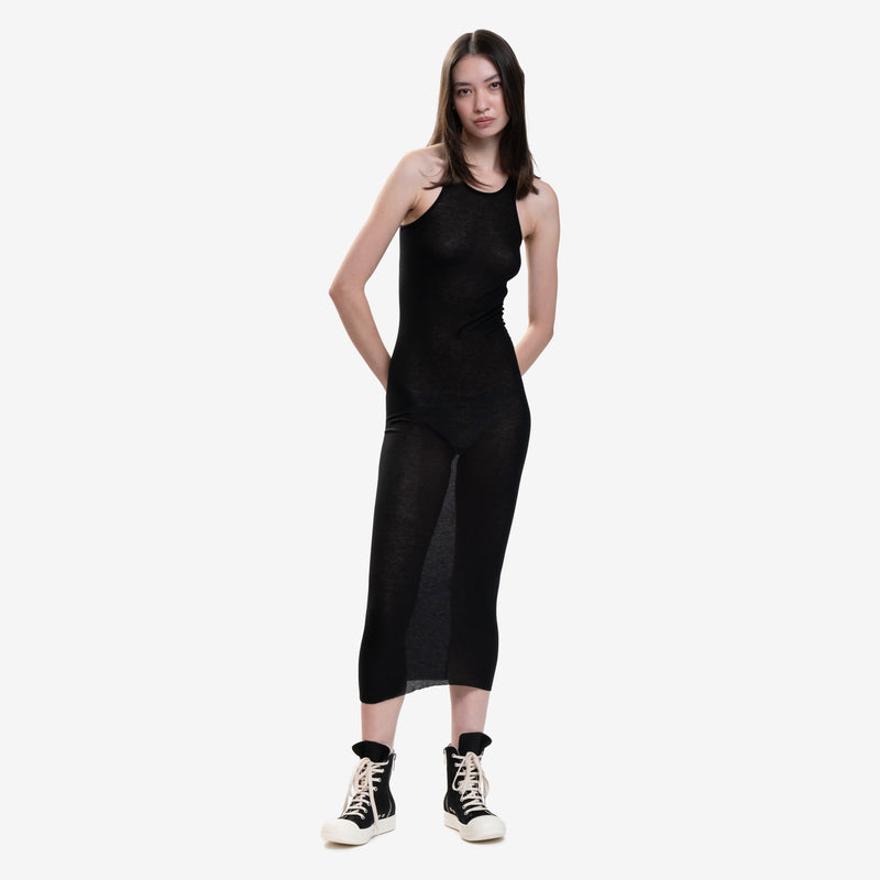 This tank dress has a close fit and falls below the knee. It features a round neckline and thin shoulder straps that lead to a slight racer back. The raw cut hem and signature single seam down the center back spine add a unique touch.