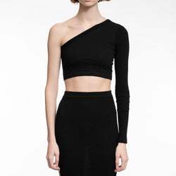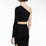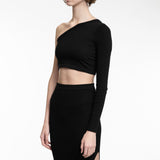 This cropped Ladies Ziggy Top features an above waist length and a unique asymmetrical, single shoulder neckline complemented by a long left sleeve for a modern look.