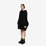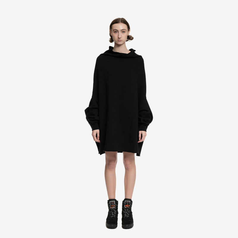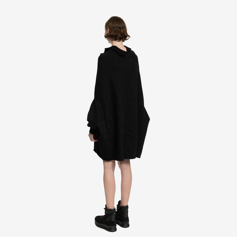 This Shroud Sweat has a hip-length design and is characterized by a tubular draped neckline that widens as it reaches the shoulders. The low armholes are accompanied by ribbed cuff sleeves, and there is a split in the center front neck. Additionally, there is a signature seam line that runs down the center back spine.