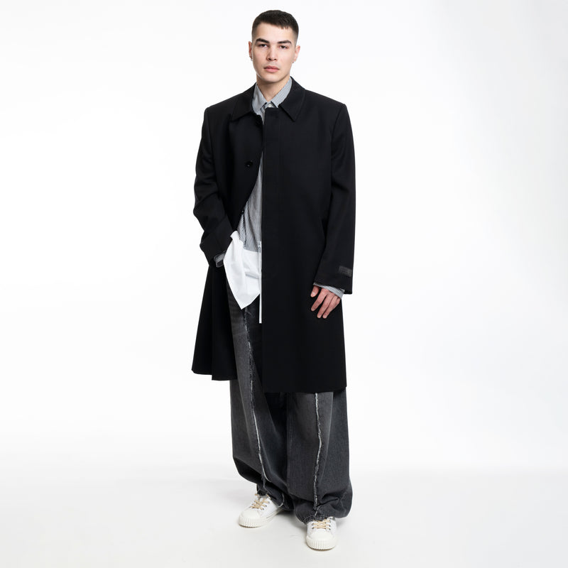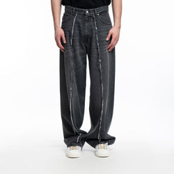 These grey denim trousers from MM6 are expertly crafted in Italy with a wide leg and a raw-edge central seam. Made from cotton denim, they feature a button closure, belt loops, and the brand's signature horizontal line of white stitches on the back, along with a numeric jacron label.
