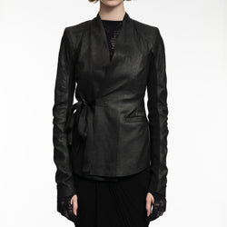This Hollywood jacket is designed with long, sleek sleeves and a collarless V-neckline for a timeless, sophisticated look. The double-breasted front wraps and secures with a tie and an internal elastic belt, creating a fitted shape that flares over the hips. To add versatility and functionality, it features side back vents and two front jet pockets. Additionally, it is partially lined with two internal pockets that can be buttoned for added security.