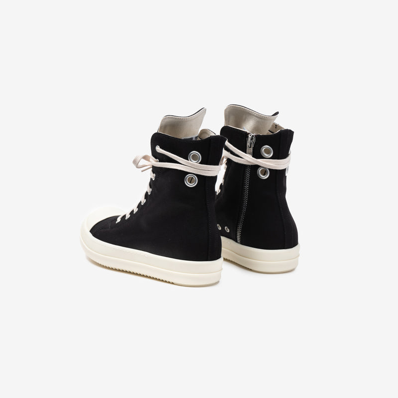 Rick Owens DRKSHDW women's high-top canvas sneakers bring bold style and everyday comfort. These black canvas sneakers feature contrasting taupe laces, a sturdy rubber sole, and side zip details for easy wear. Their minimalist yet edgy design offers a perfect blend of fashion and function.