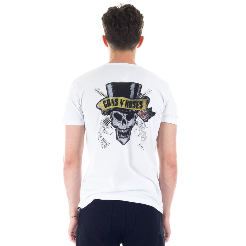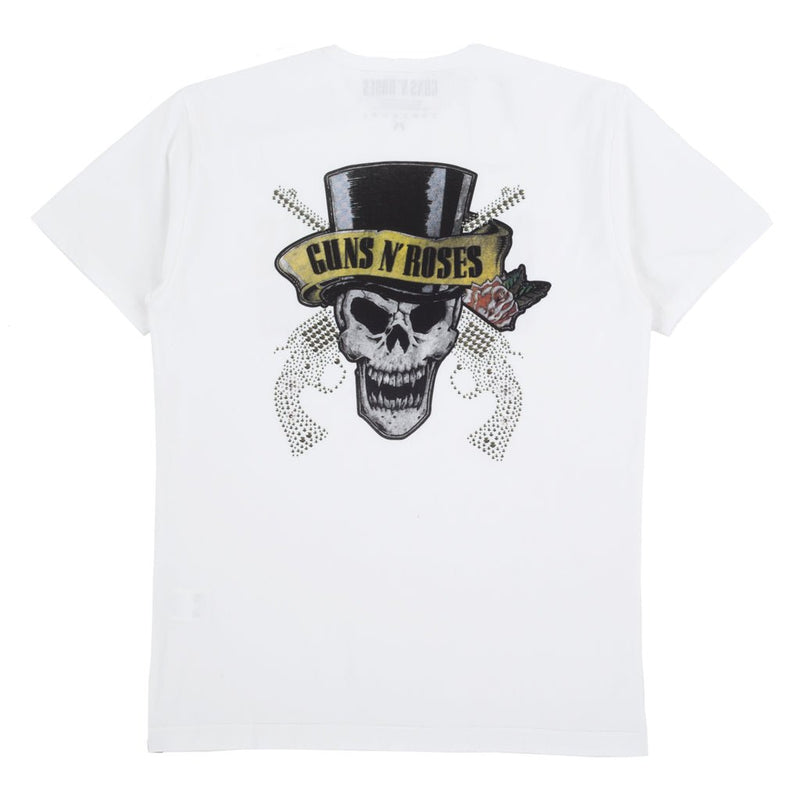 The Guns N Roses Skull Stud T-Shirt features the iconic Guns N Roses "Appetite for Destruction" artwork on the front and a top hat skull motif on the back. Adding to the edgy rock aesthetic, the back also showcases studded revolver guns and sparkling Swarovski crystals. Made in Japan with 100% cotton, this shirt is sure to make a statement.