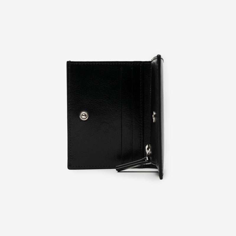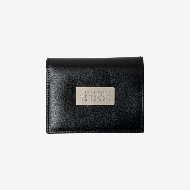 Expertly crafted with buffed calfskin in classic black, this bifold wallet features a logo plaque and signature white stitching on the back face, as well as a convenient press-stud closure. It also includes a zip coin compartment, two card slots, two patch pockets, and one note slot for organized storage.