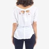 Unravel Project Women's Distressed Tee, crafted from 100% Italian cotton for a soft, breathable feel. Featuring a subtle distressed design with unique cut-out details on the back, this tee blends edgy style with everyday comfort. Perfect for layering or wearing on its own. Made in Italy.