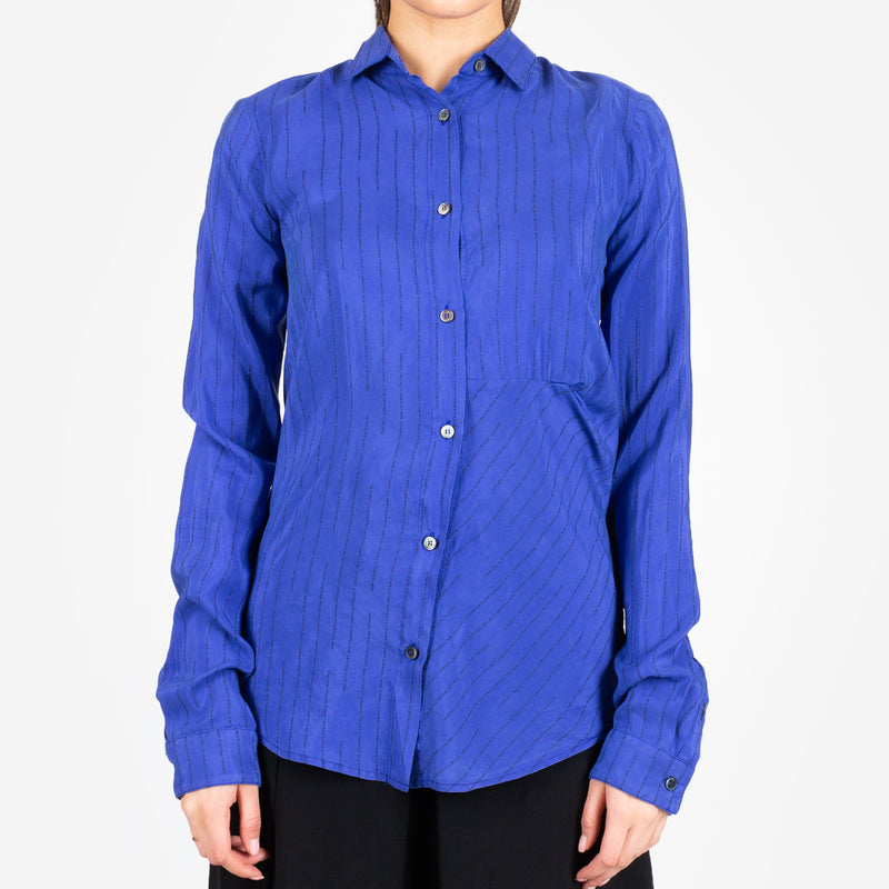 The Unravel Project Women's Stripe Draped Shirt offers an elegant, modern look with its fluid silk construction. Crafted in Italy, this luxurious blue shirt features subtle striped detailing and a unique draped fit that combines sophistication with a relaxed vibe, perfect for any occasion.