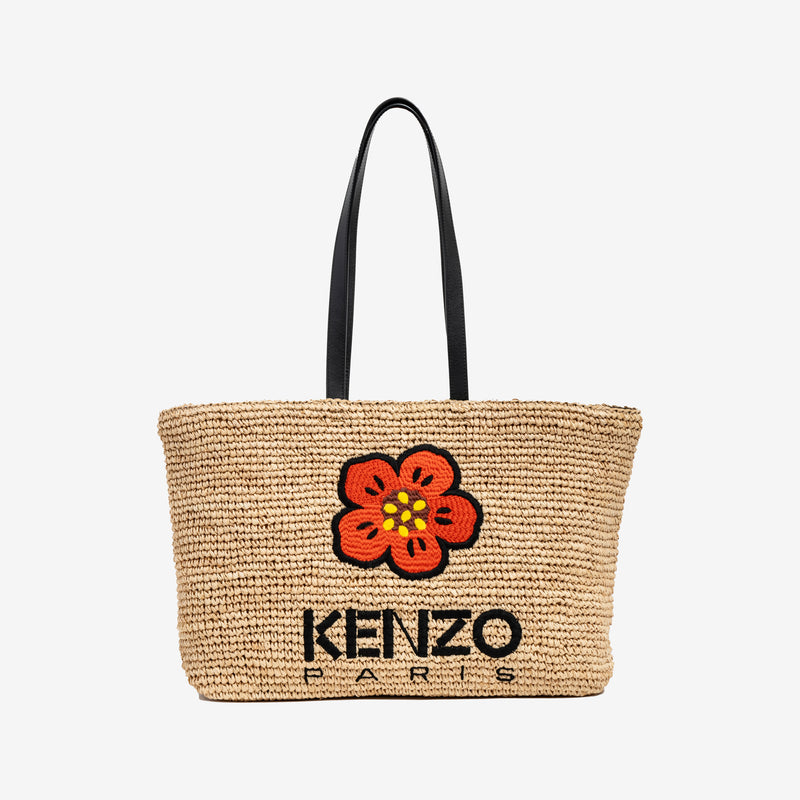 This spacious tote bag features a unique graphic showcasing the 'BOKE FLOWER' motif. This design, inspired by raffia bags, complements this season's ensembles perfectly. Its ample size also makes it a versatile choice for both city outings and beach trips.