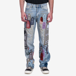 These Who Decides War jeans feature vibrant cathedral-inspired patches that make a bold artistic statement. With intricate embroidery in varied colors on a distressed denim base, they blend religious iconography with streetwear flair, adding depth and cultural commentary to any look.