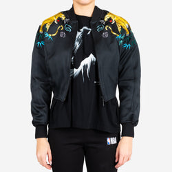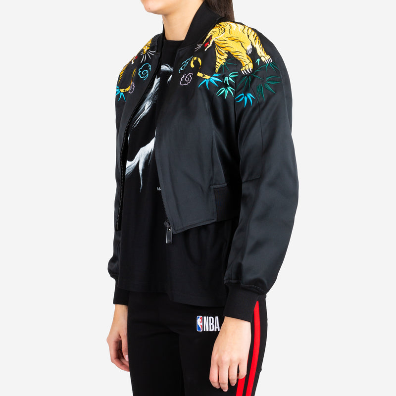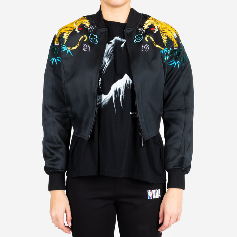 This Women's Amine Bomber by Marcelo Burlon features embroidered tigers set in a jungle scene on the shoulders. It also includes a rib knit collar, cuffs, and hem, as well as front pockets. This bomber is made in Italy from a blend of 48% polyester and 52% polyamide.