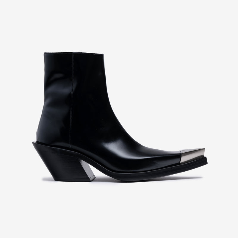 These AIG boots feature a glossy black finish with a sharp square toe accented by a silver metal cap. The angular heel and side zipper add a bold, modern twist to this striking design.
