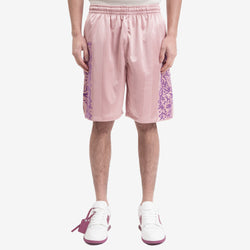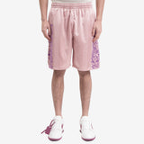The Bluemarble Basketball Shorts blend luxury with streetwear, featuring a silky pink finish with vertical stripes and intricate purple embroidery on both sides. Designed for comfort and style, they have an elastic waistband for a relaxed fit. Pair them with sneakers for a standout sporty look with a fashion-forward edge.