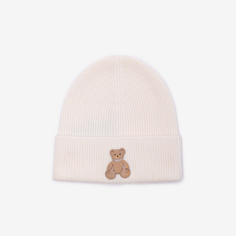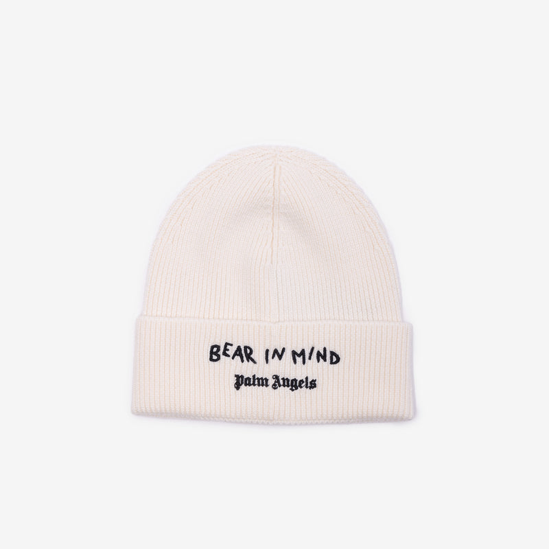 Introducing a new version of a beloved character: the teddy bear now has his own dedicated collection, available in various sizes and styles. Our white ribbed beanie showcases a signature "fixed" teddy bear patch on the front, with the motto "Bear in Mind" and the Palm Angels logo embroidered in black on the back.