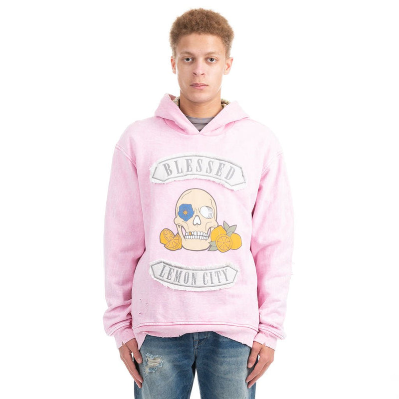 Enhance your wardrobe with the Alchemist Blessed Hoody. This hoodie features a beautiful Rose quartz wash and subtle distressing throughout, creating a unique and stylish look. The knitted lining on the hood adds extra comfort and warmth. With the BLESSED and LITTLE RIVER patches on the front and skull patch on the front, this hoody is a must-have for fashion-forward individuals. Crafted from 100% CO and made in Italy, it is a quality piece that will elevate any outfit.