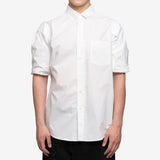 The Cotton Poplin Buttoned Shirt showcases traditional design elements, accentuated by an embroidered artwork of numbers on the front. Adding a touch of wit to the collection, the cuffs are attached at the shoulder, creating a sleek and minimalist look for this timeless piece.