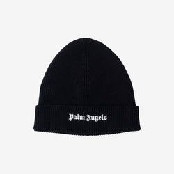 Palm Angels Unisex Classic Logo Short Beanie in Black features a sleek design with the iconic Palm Angels logo embroidered on the cuff. A versatile and stylish winter essential.