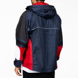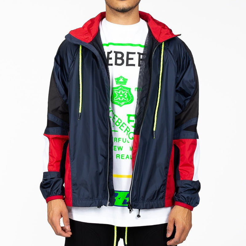 The Iceberg Convertible Sport Jacket blends functionality with bold style. Featuring a lightweight nylon construction, this zip-up jacket showcases a dynamic color-blocked design in navy, red, black, and white. Adjustable drawstrings, a packable hood, and sporty paneling make it perfect for versatile styling and active wear.