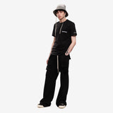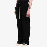 These Creatch cargo pants are full-length, with an elasticized waistband and drawstring closure, as well as a stitched fly. They also have layered front pockets with side belt straps, signature stitching lines, and two back square patch pockets with flaps and topstitching.