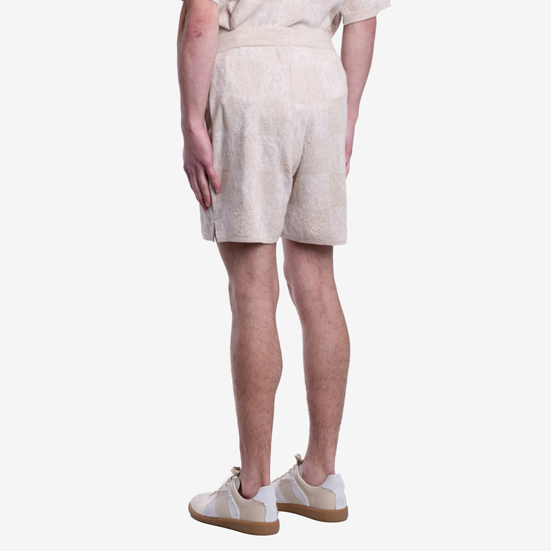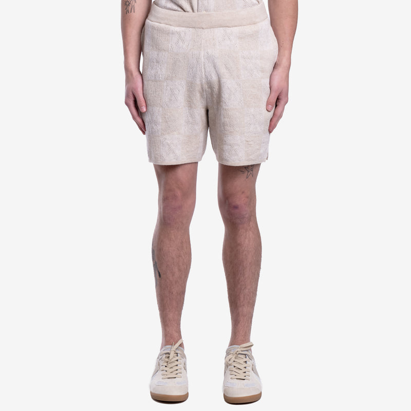 These Represent crochet shorts feature a unique textured design with a beige checkered pattern. Made from a lightweight fabric, the shorts offer a relaxed fit and an elasticated waistband for comfort. Perfect for summer, these versatile shorts can be paired with the matching shirt for a cohesive look.
