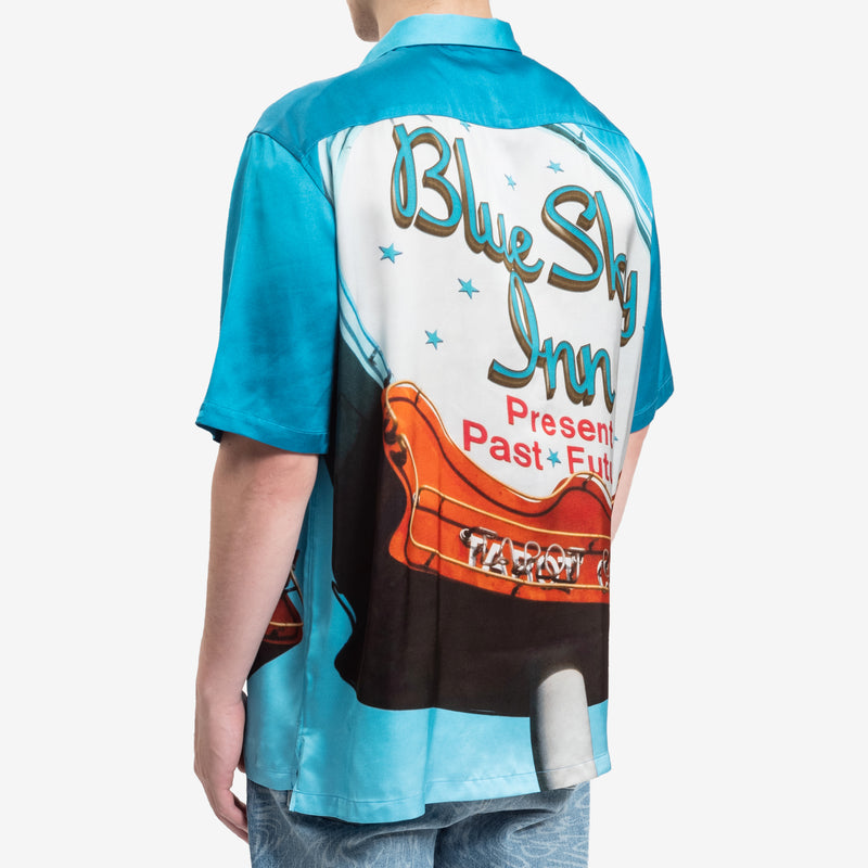 The Crystal Ball Shirt from Blue Sky Inn features a prominent graphic of the motel's sign, covering the entire front of the shirt. It is made of 100% Viscose and is crafted in Italy. The button enclosure adds a classic touch to the overall design.