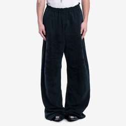 The MM6 sweatpants feature a relaxed, oversized fit with an elastic waistband. Distressed detailing runs down the front, adding texture to the deep black fabric, perfect for a casual, edgy look.