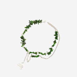Introducing the Diopsides Chain Necklace by Sankuanz, crafted from 100% natural green diopside stones. The necklace features a Sankuanz logo pendant and is secured with an eye and loop closure. Made with high-quality .925 sterling silver.
