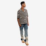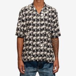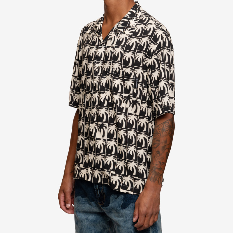 A bold take on a classic silhouette, the Palm Angels Dripping Palms Bowling Shirt stands out with its all-over palm tree print in a grid-like formation. Crafted from lightweight fabric, it features a relaxed fit, camp collar, and a button-up front for effortless styling. The monochrome palette makes it a versatile statement piece.