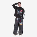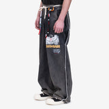 The RRR123 Father Working Pants combine utilitarian design with bold streetwear elements. Crafted from washed black denim, they feature raw contrast stitching, graphic patches, and an adjustable rope belt with carabiner details. The wide-leg fit and distressed finishes add a worn-in feel, while side stripes and handcrafted beaded accents bring an artisanal touch to this statement piece.
