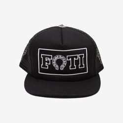 Chrome Hearts FOTI Patch Trucker Cap with bold embroidered patch on the front and .925 sterling silver CH Plus pin on top. Adjustable fit. Made in the USA.