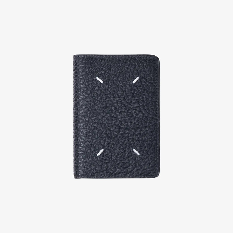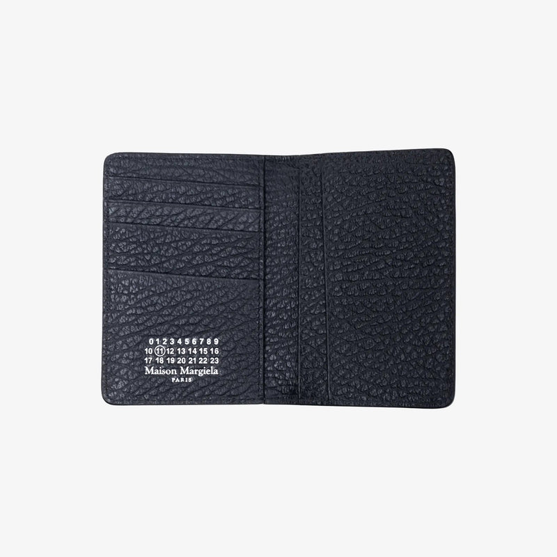 Compact bifold in richly grained calf leather. The exterior bears the house’s four signature stitches; inside are six vertical card slots and two slips for notes or receipts with the numeric logo stamp. Edge-painted, Italian-made, and slim to disappear in a pocket.