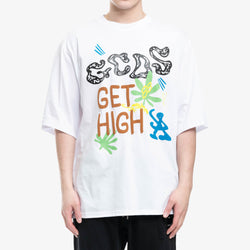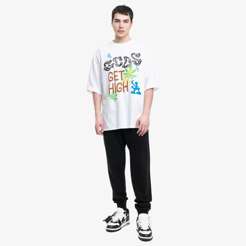 The GCDS Get High Oversize Tee delivers a playful and bold statement with its vibrant graphic print. Crafted from soft cotton, this oversized white t-shirt features graffiti-style lettering, abstract figures, and tropical-inspired elements. A relaxed silhouette makes it a standout piece for effortless streetwear styling.