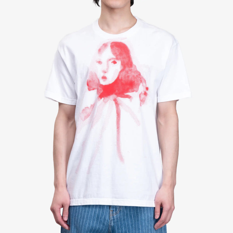 The KidSuper Halftone Girl Face T-Shirt features a bold red portrait graphic of a woman printed in an artistic, painterly effect on soft white cotton. Designed in a relaxed fit with short sleeves and a classic crew neckline, this tee captures the brand's creative and expressive spirit with a streetwear edge.