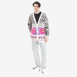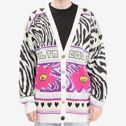 The Jacquard Cardigan, featuring an all-over Zebra and Daisy graphic, offers a five-button front enclosure with customized, curated buttons. Made in France with a combination of 85% Sheep Wool, 10% Cupro, and 5% Polyester, it boasts a rib knit cuff and hem, providing both style and comfort.
