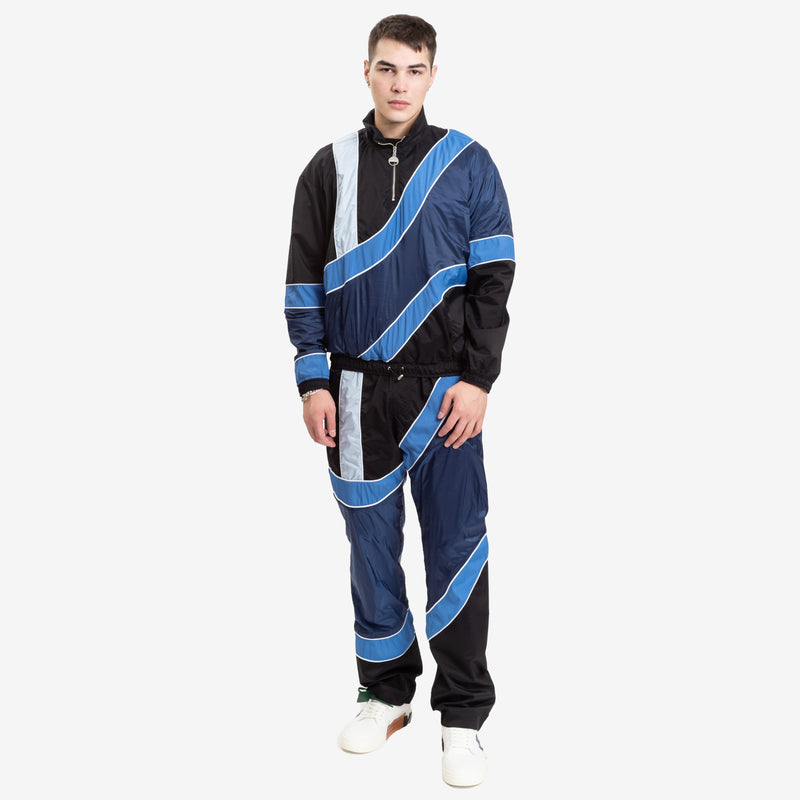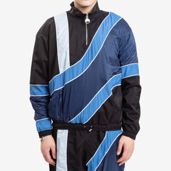 The Ahluwalia Kike Track Jacket boasts a modern design with exclusive wave gradient panels. It features a quarter zipper and stand collar enclosure, as well as elasticized cuffs and hems for a comfortable fit. The hem also includes a concealed drawstring with a cord lock for added adjustability. With metal Ahluwalia hardware and made of 100% PA, this jacket is proudly made in Tunisia.
