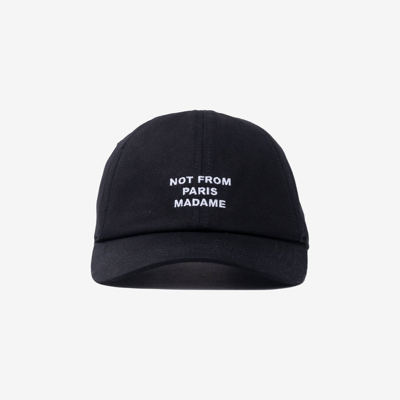 This stylish 6-panel baseball cap is made of 100% cotton and features an engraved metal buckle with the word 'Drôle'. The front is embroidered with the phrase 'Not From Paris Madame'.