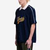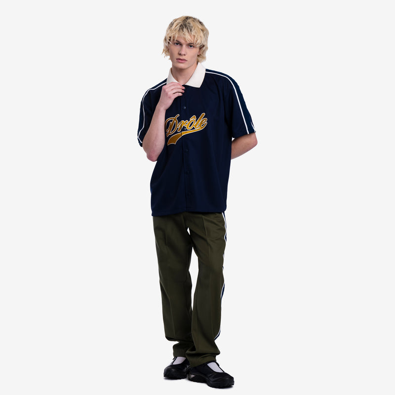 Casual tone: This navy short-sleeved shirt has a sportswear influence, with a 'Drôle' embroidery on the front and braided knit trim on the sleeves. Featuring a ribbed collar and six snap buttons, it's perfect for a casual look.