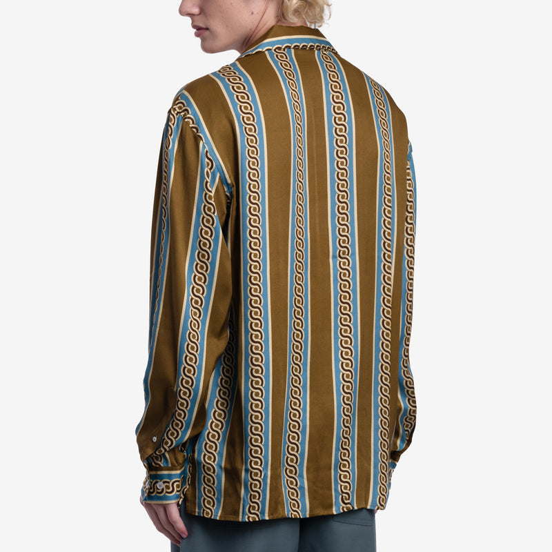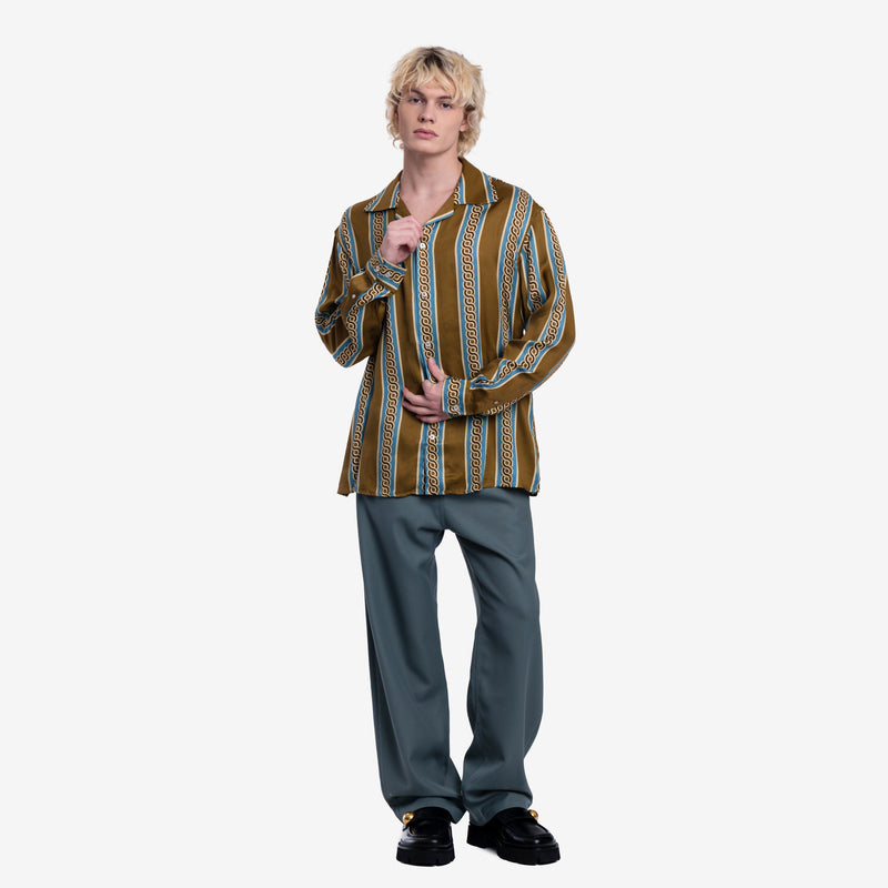 This Drole de Monsieur shirt boasts a bold, retro-inspired design with vertical stripes in earthy tones of mustard and teal. The soft, flowing fabric and relaxed fit make it comfortable and stylish, while the intricate chain-like pattern adds a touch of vintage charm.