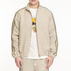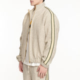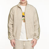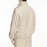 This long-sleeved jacket features a high neck, a back logo label, a zipper closure, and convenient side welt pockets.