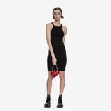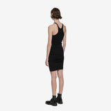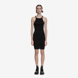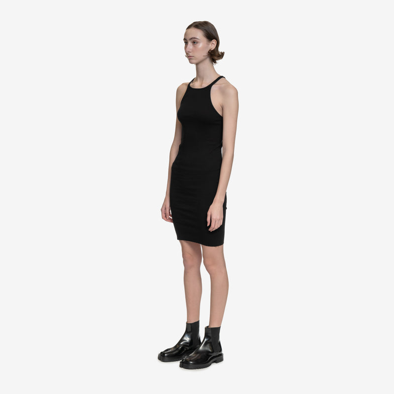 This tank dress features a mid thigh length and a straight raw-cut hem. Its design includes a round neckline, thin shoulder straps, and a racer back that accentuates the figure-hugging body and short skirt. The signature single seam runs down the centre back spine.